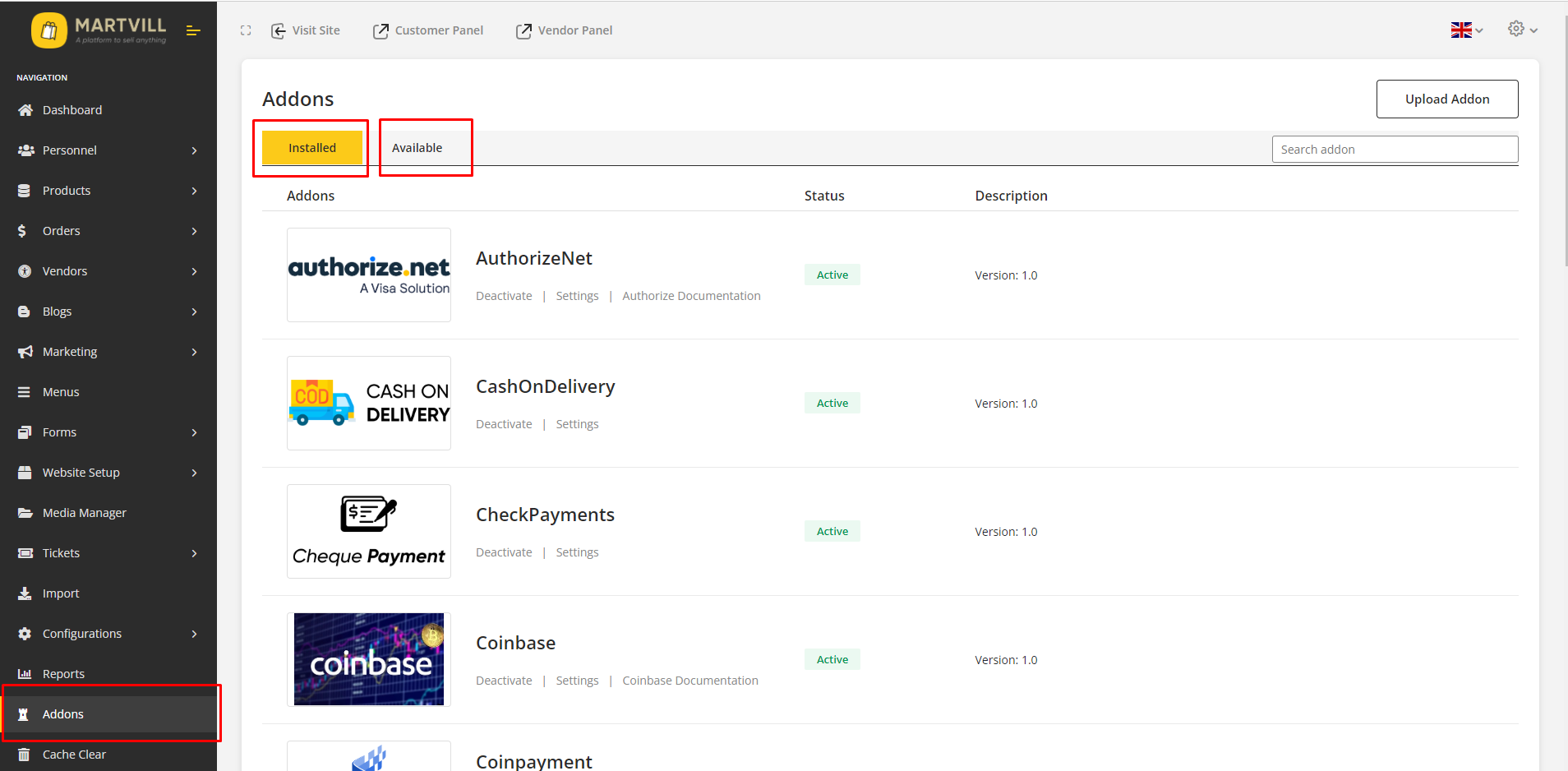 Addonsfrom the sidebar. There are two available options for the addons,InstalledandAvailable Addons.