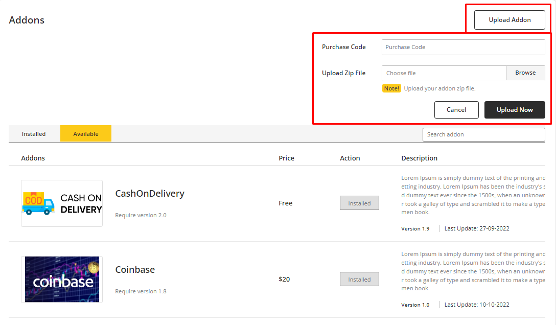 - To install the purchased addon, click Upload Addon. Enter the purchased code and upload the file on Purchase Code and Upload Zip File field respectively. Click on Upload Now. It will install the addon to the system and it can be seen in Installed list.