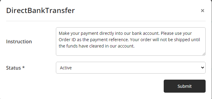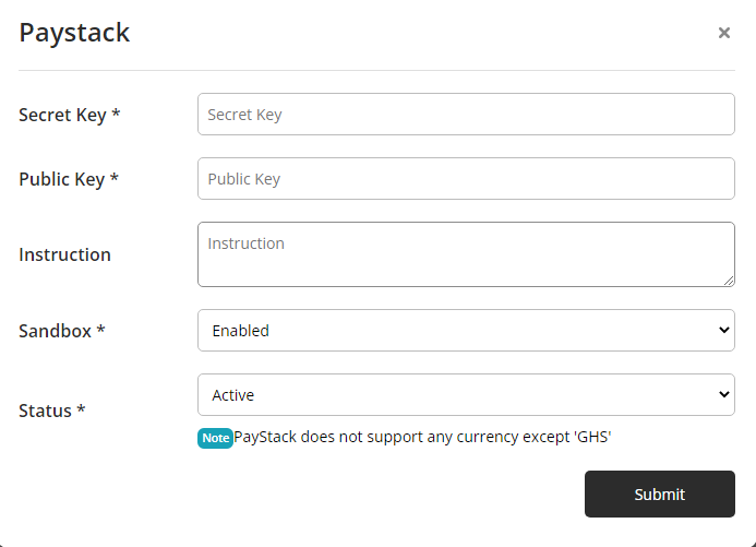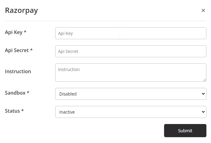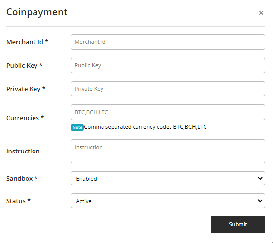 enable, status isactive, then click onsubmit. It will save the credentials and the payment method will be activated in the system.