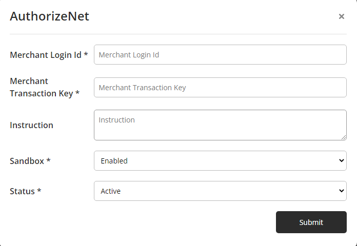 Merchant Login Id, Merchant Transaction Key are needed to configure AuthorizeNet.