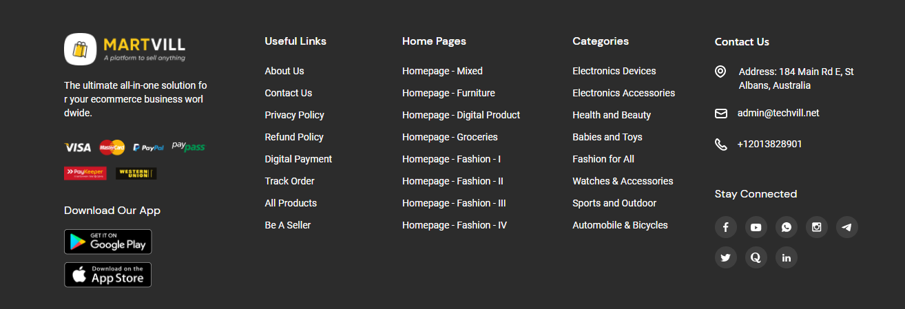 Imagefor Google Play and App store is same as previous section. Linkfields are same as previous section.- If the section is disable, then this elements will not show on the footer.