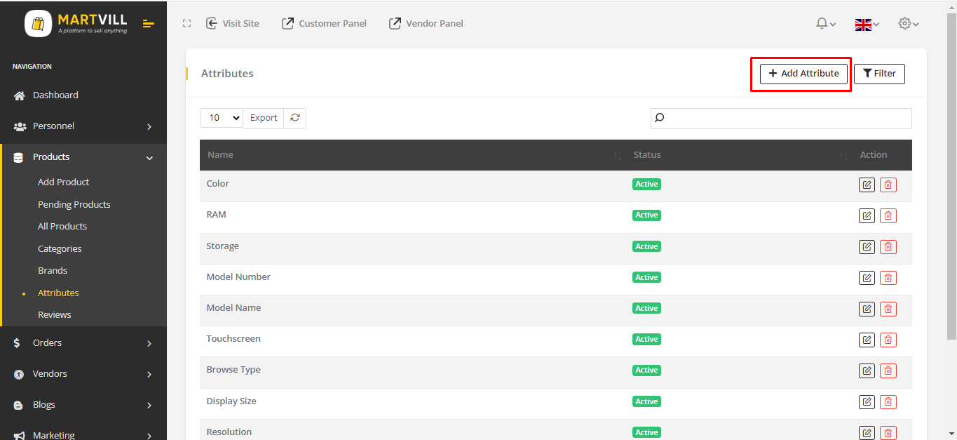 Go to MartVill Dashboard > Products > Attributes and Click on Add Attribute