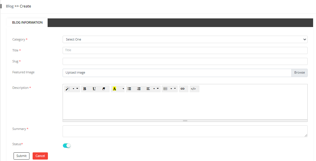 3. Select a Blog Category, Give a title and Fill the other information according to your blog and Click Submit to publish it.