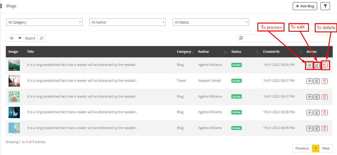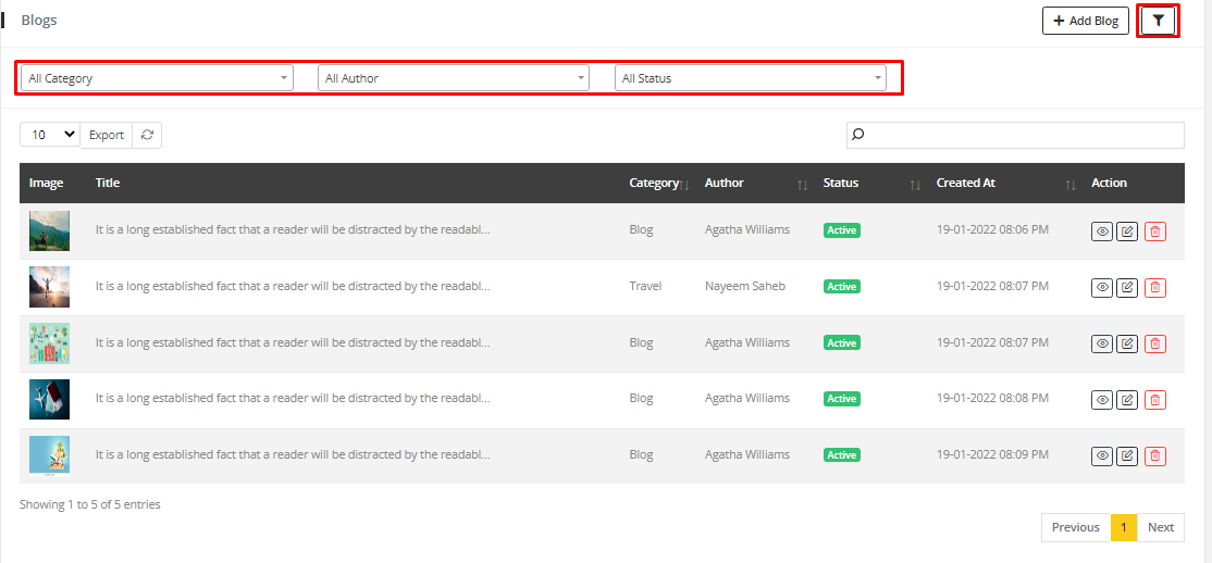 5. Clicking filter icon, status and author and category filter will appear by which blog can be searched by their status, author and category.