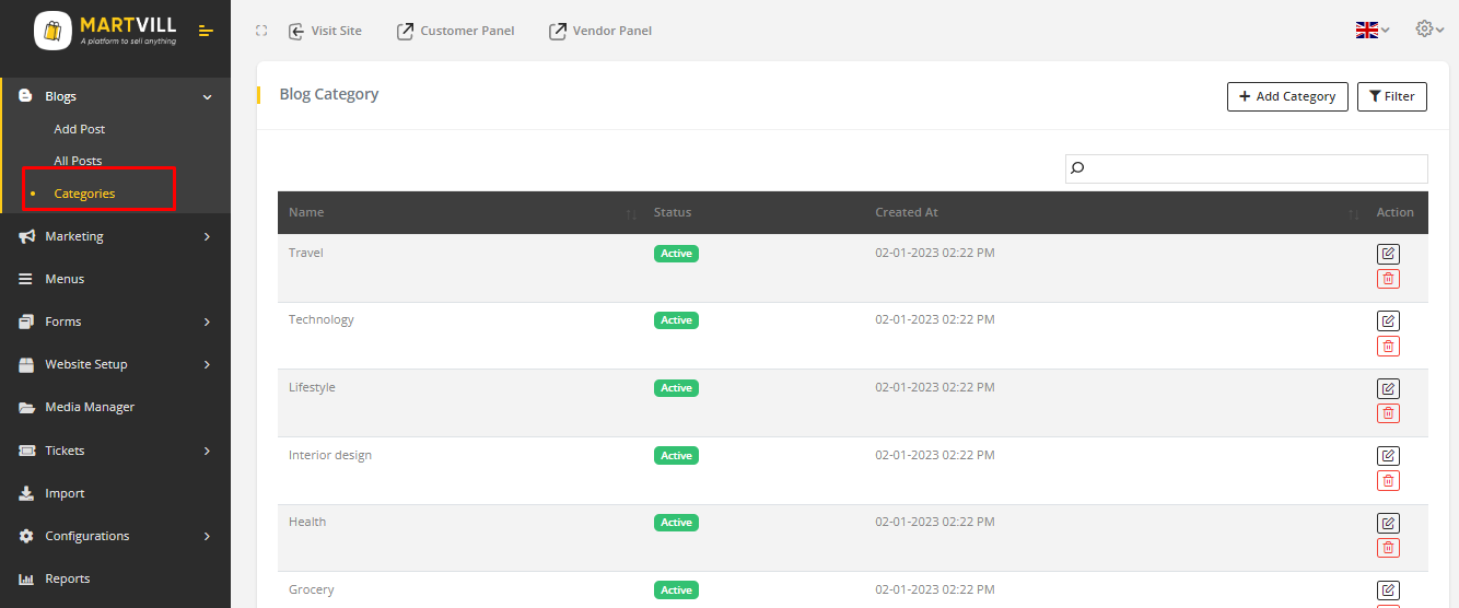 1. Go to Blog->Category from the sidebar.