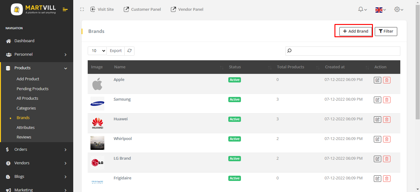 Go to MartVill Dashboard > Products > Brands and Click on Add Brands