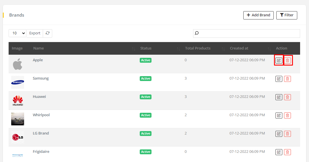- To Delete or Edit a brand. Go to Brand list and Click Edit icon to Edit and Delete icon to Delete the Brand.