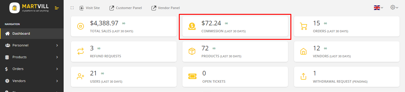 Commission in the MartVill defines as Admin Revenue. Commission will be deducted from every order. There are three levels of commission, First one is Vendor, Second is Category based and third is default.
