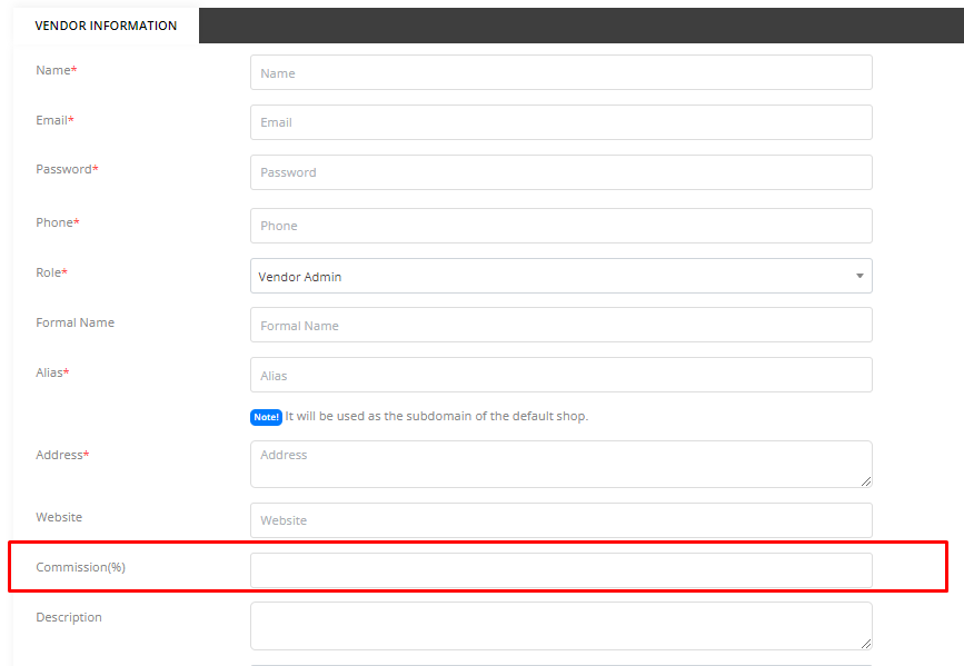 You can set the percentage of the commission while adding a root category or a sub category to the system. If Vendor does not have commission set then the category based commission will be counted. Commission will be cut off according to the category on every order.