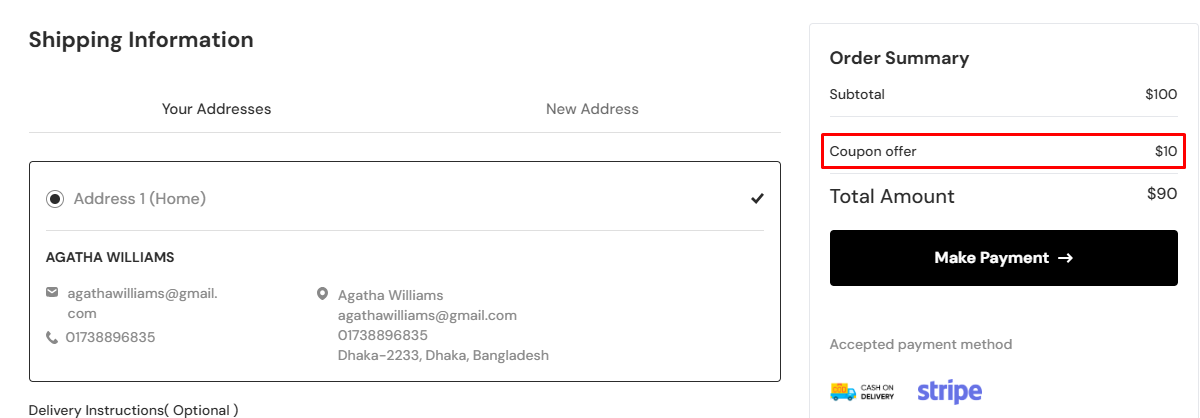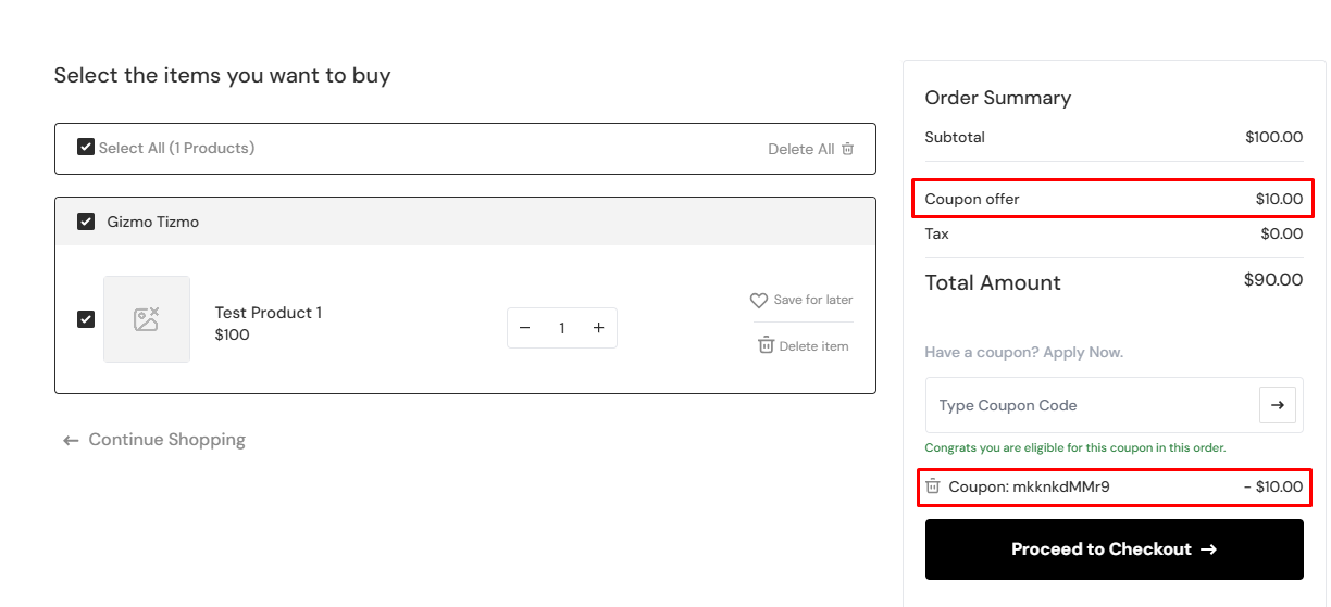 Once a coupon is successfully applied on cart then the coupon code of the coupon which has been applied along with the discounted amount will be displayed below the coupon section. A user can keep the coupon and proceed further on the order or can even remove the coupon once it is applied.