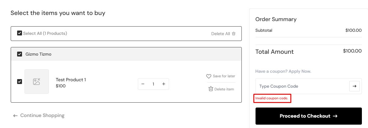 However, if any user tries to apply any invalid coupon then the alert message should appear that the coupon is not valid for this order.