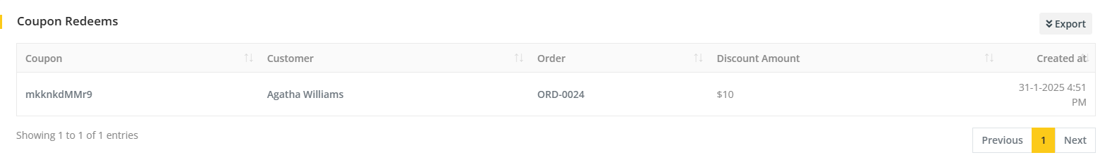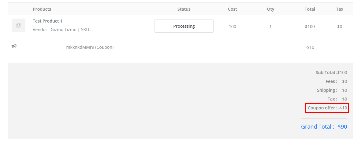Once a coupon is applied to process an order, the details of the coupon will also be available for the order details page as well. An admin or vendor can see if any coupon is applied on the order from the order details page.