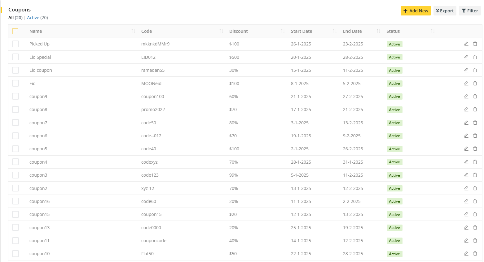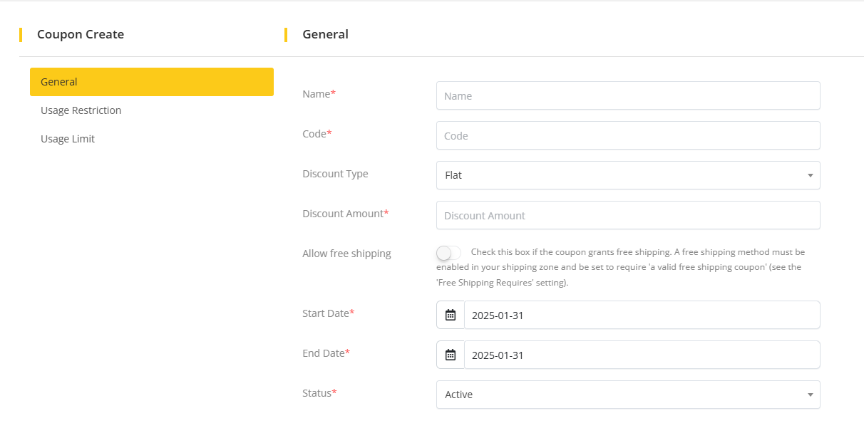Admins must provide a name, code, and discount type (Flat or Percentage) when creating coupons. They can also configure free shipping, validity dates, and coupon status.