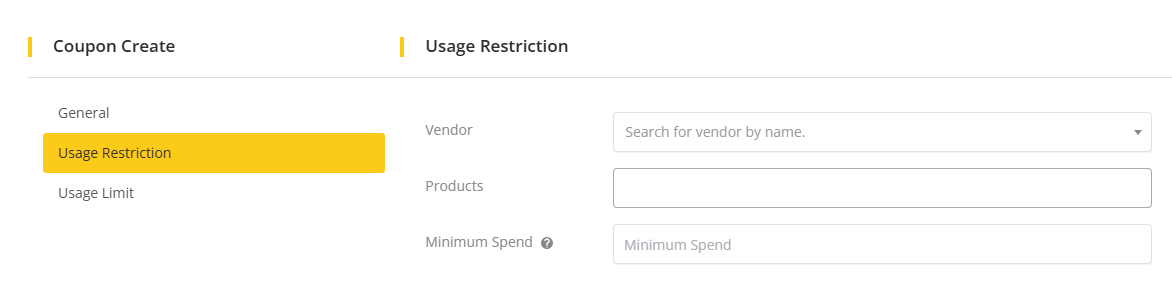 An admin can set specific restrictions for a coupon as well. An admin can select the vendors for whom the coupon will be available for. If no specific vendor is selected then the coupon will be available for all the vendors of the system. If any specific vendor(s) is selected then admin can choose any specific products of that vendor(s). If no specific product(s) is selected from those vendor(s) then all the products of those vendor(s) will be available for coupon application. Furthermore, if no specific vendor(s) is selected, the admin can choose any specific product(s) of the system and those product(s) will be available for that coupon application. However, if no specific product(s) is selected then all the product(s) of the system will be available for coupon application. The admin can also configure the minimum spend amount in order to apply a coupon which means a user has to minimum spend that amount in the order in order to apply that coupon in that order.