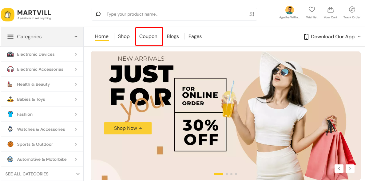 A user can see all the available coupons of the system from the homepage Coupon navbar.