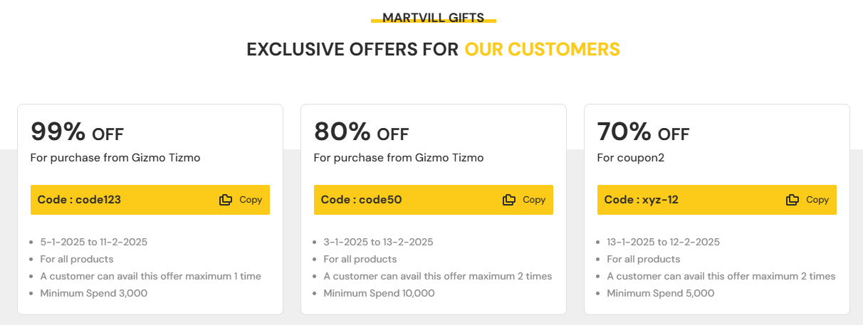 On this page, the user will be able to see all the coupons of the system and can copy the coupon codes to apply them for purchasing any order. All the conditions to apply that coupon will be displayed under that coupon section.
