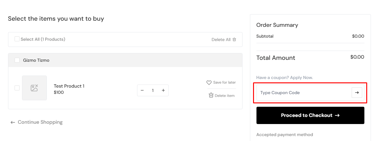 While purchasing an order, a user can provide a coupon on the cart page of the order. After providing the coupon code on the cart page,a user has to click on the arrow icon. If the coupon is valid then the discounted amount will be applied and the total amount will be adjusted. After the amount is adjusted the user can go to the Checkout page and proceed with the order procedure.