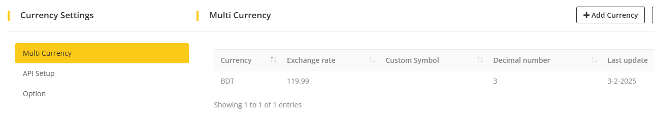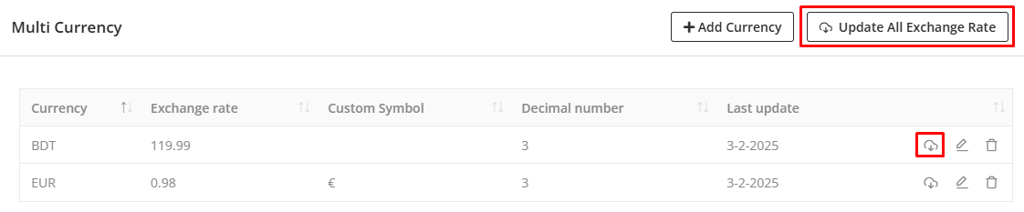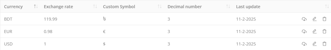 After creating a currency, an admin edit or delete any currency from the list. The admin can also update the current exchange rate of any specific currency or can update the exchange rate for all the currency of the list.