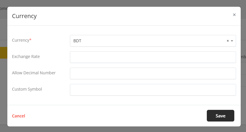 The admin has to click on the Add Currency button in order to add new currency. Once the admin click on the Add Currency button, a modal will pop up to add new currency. In this modal, the admin has to select a currency, provide an exchange rate based on the base currency, provide a decimal number value(the value provided here will work as the decimal format when user changes the currency to this currency) and a custom symbol for that currency. After providing all the information, the admin has to click on Save button.