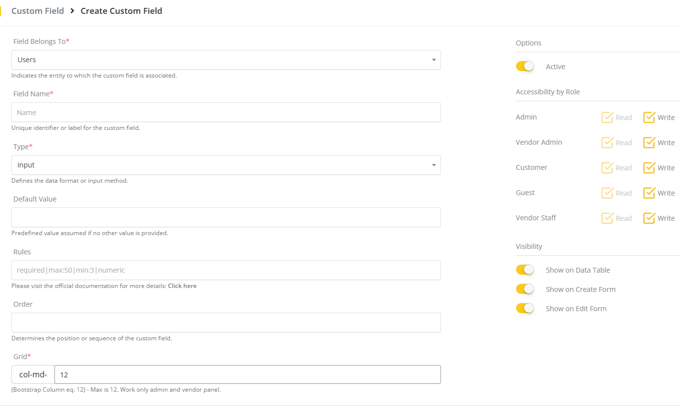 On the form, the admin will have to choose where custom field should belong to. After that, the admin has to provide a custom field name, select the custom field type, provide the default value which will show as default for that specific custom field, provide the rules which will be applied for the custom field, provide an order number for that specific custom field and provide a grid value for that specific custom field which can maximum be 12 and will only work for admin and vendor panel. The admin set the status of the custom field, allow the accessibility permissions for all the roles of the system and can configure the visibility settings as well.