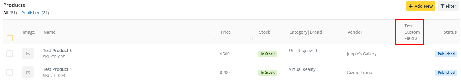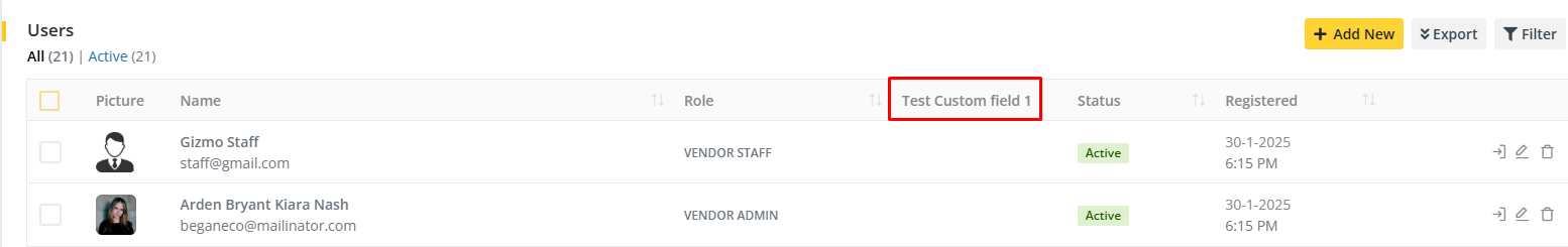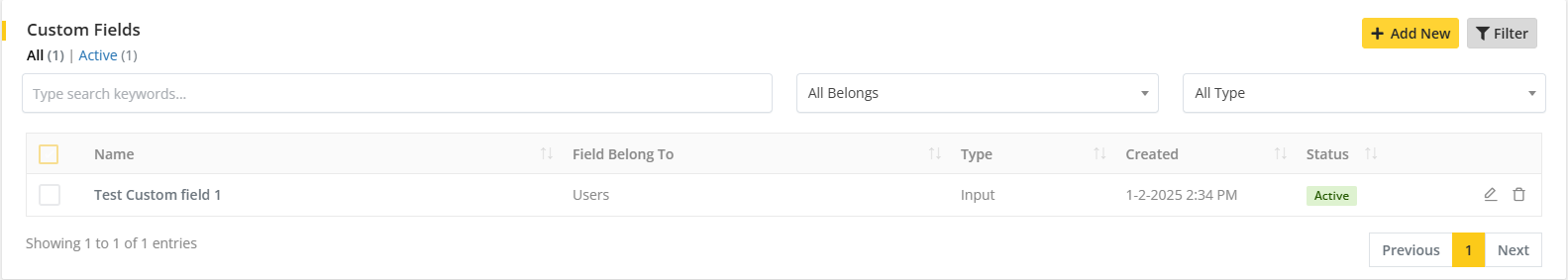 The admin can filter the custom field list by keywords which can be the custom field name or can even filter the list with custom field location and type as well. Furthermore, the admin can edit and delete any specific custom field from the list as well.