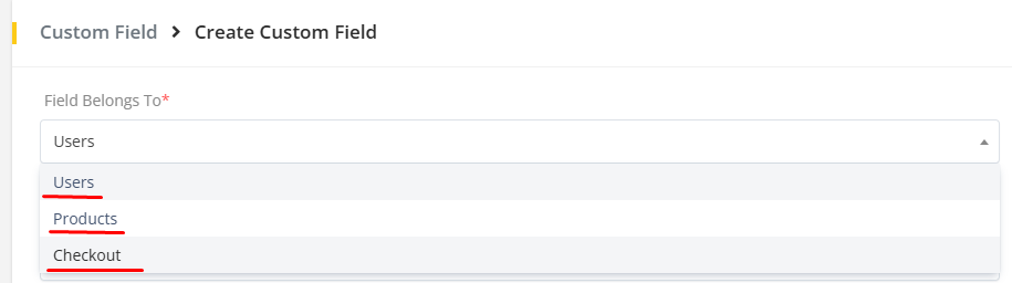 While creating a custom field, an admin can select the custom field location to three places which are- users, products and checkout.