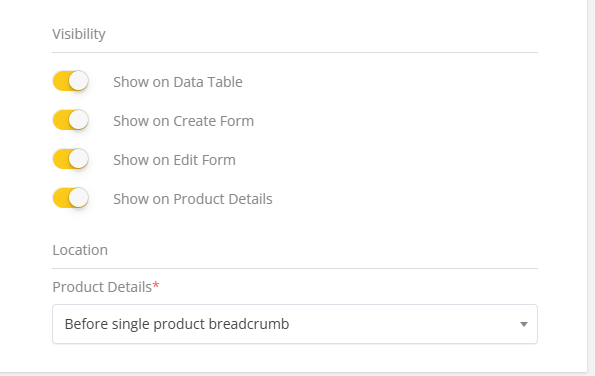 The admin can also select the custom field location as products. If custom field location is selected as products then the visibility options that the admin can configure are product list(data table), product details page, creation form and edit form. The admin can also select where the custom field will be displayed on the product details page by selecting a specific location on the product details page.