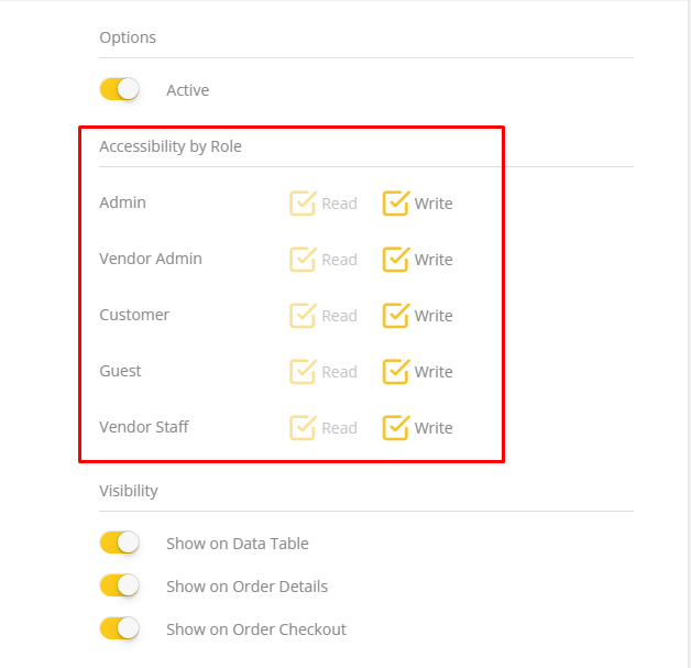 While creating custom fields the admin has to provide some accessibility permissions to user roles. The admin can provide read and write access to those roles according to his preference. Accessibility permission will be available for all the roles of the system. Please bear in mind that, if the read permission is not allowed for any specific role then the write permission can not be allowed for that role. In order to allow the write permission, the read permission should be given.