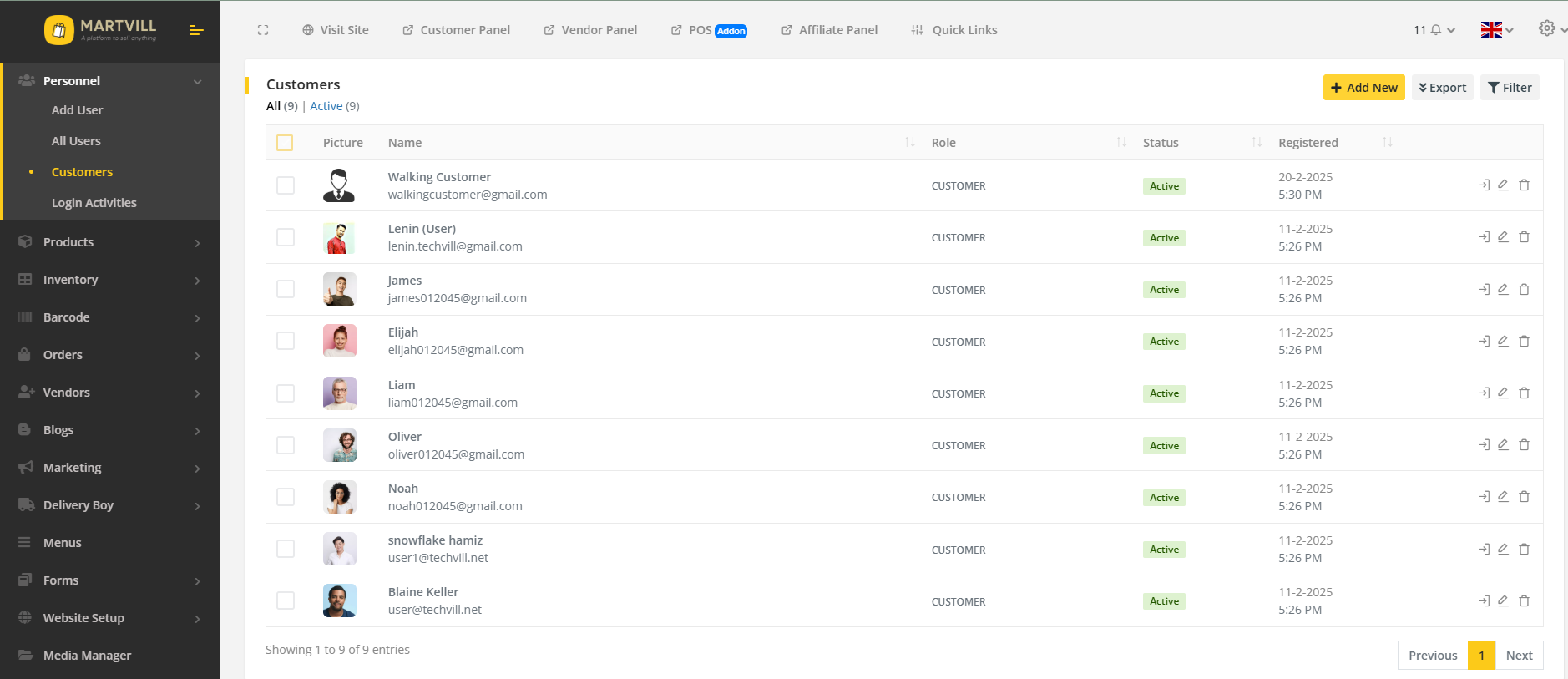 The admin can also see only the customer list of the system from Personnel-Customers. Here the admin can see only the users of the system who has a customer role and perform the same operations as like user list.