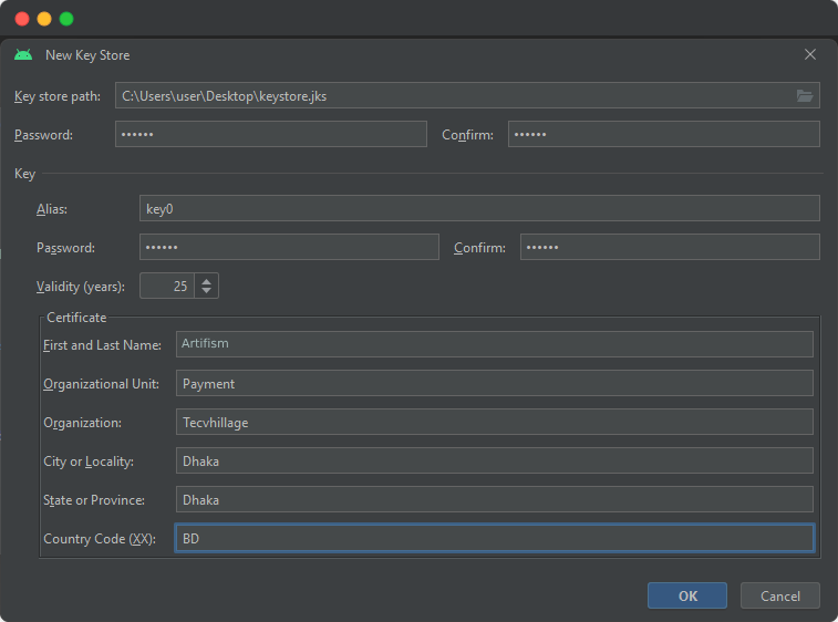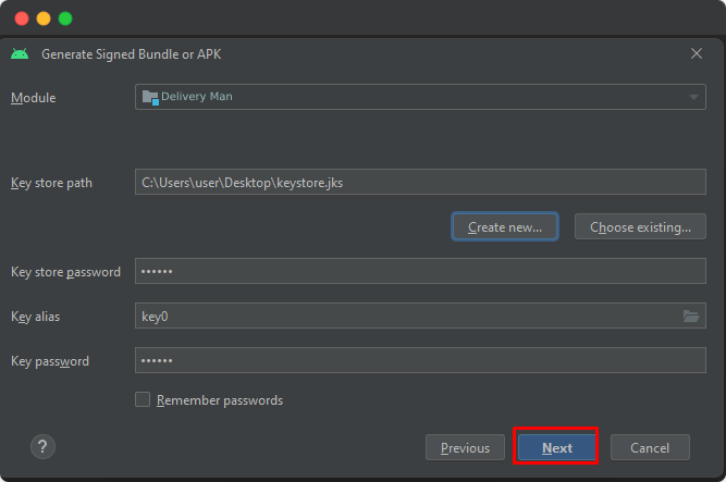 Please securely store your keystore file, keystore password, and alias password for future version updates. Click Next button