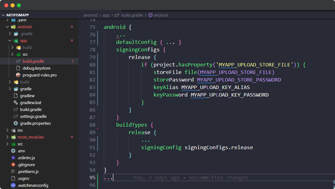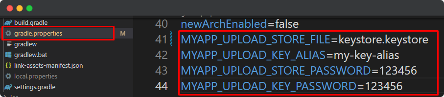 MYAPP_UPLOAD_STORE_FILE=keystore.keystore MYAPP_UPLOAD_STORE_PASSWORD=* MYAPP_UPLOAD_KEY_PASSWORD=* MYAPP_UPLOAD_KEY_ALIAS=my-key-alias
