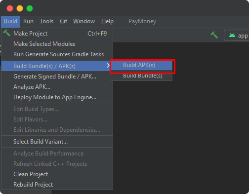 Select Build > Build Bundle(s) / APK(s) > Build APK(s).