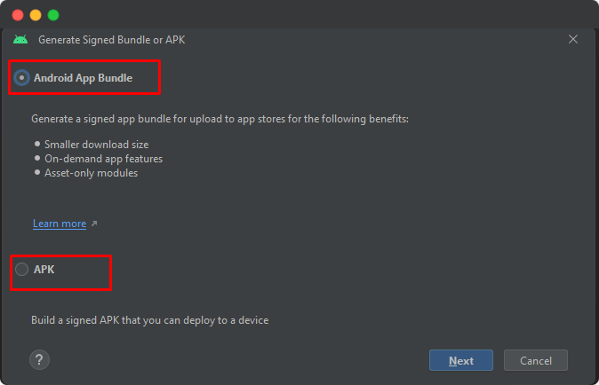 Select APK to generate a release APK or select Android App Bundle (AAB) to generate a release AAB (Play Store) for your React Native Android project. Then, click on Next