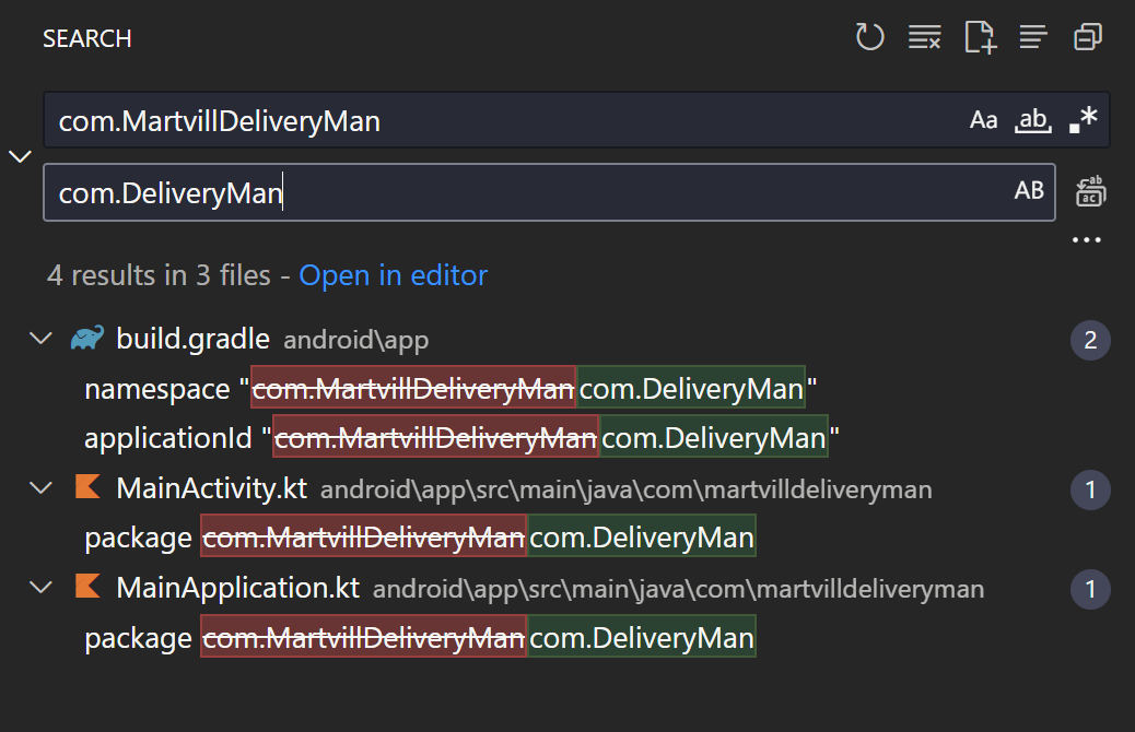 ○ Search for "com.MartvillDeliveryMan" in any code editor and replace it with