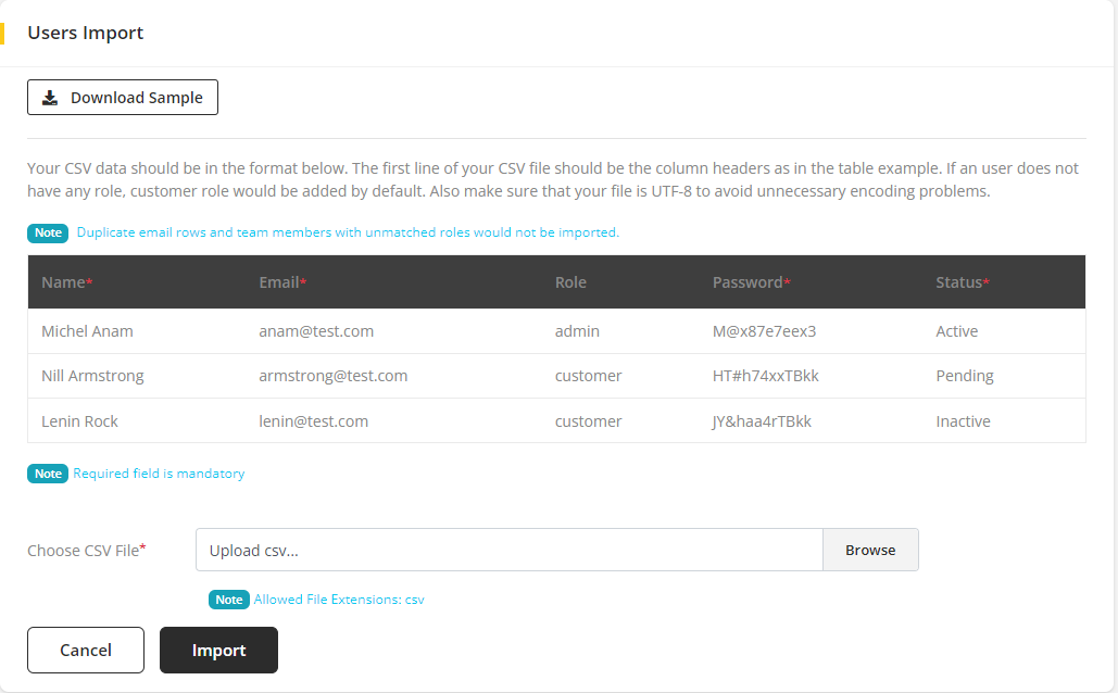 To import your user, you need to create CSV file. You can find a Sample when you click on Download Sample on the import page. There is an example given on the table.