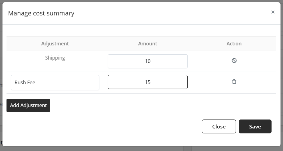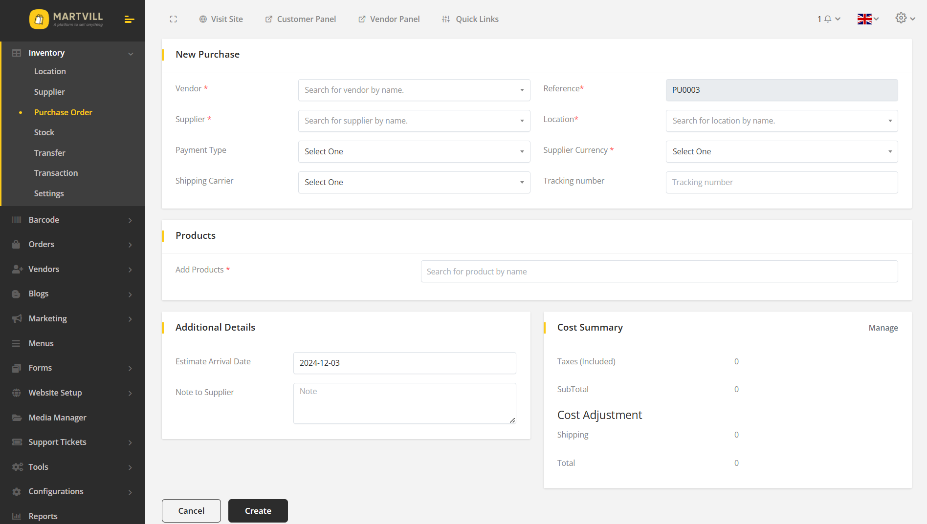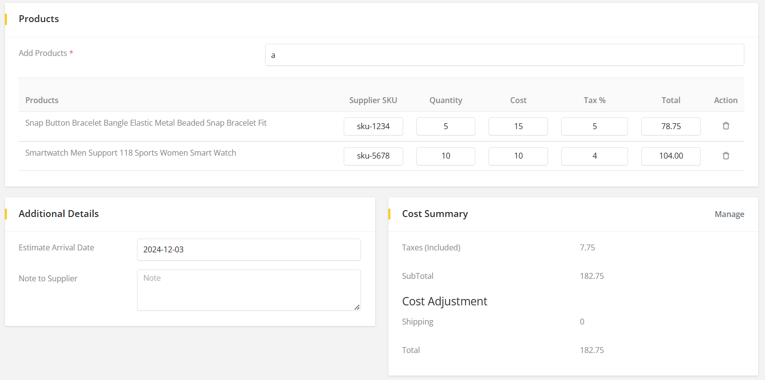 Now you can add product sku, quantity and unit price. Also you can now see the cost summary