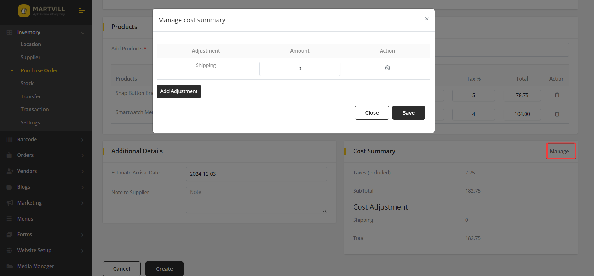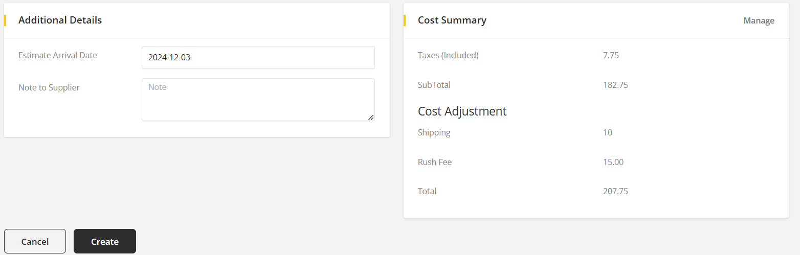 Now you can see final cost summary. Click on the create button to save the purchase order.
