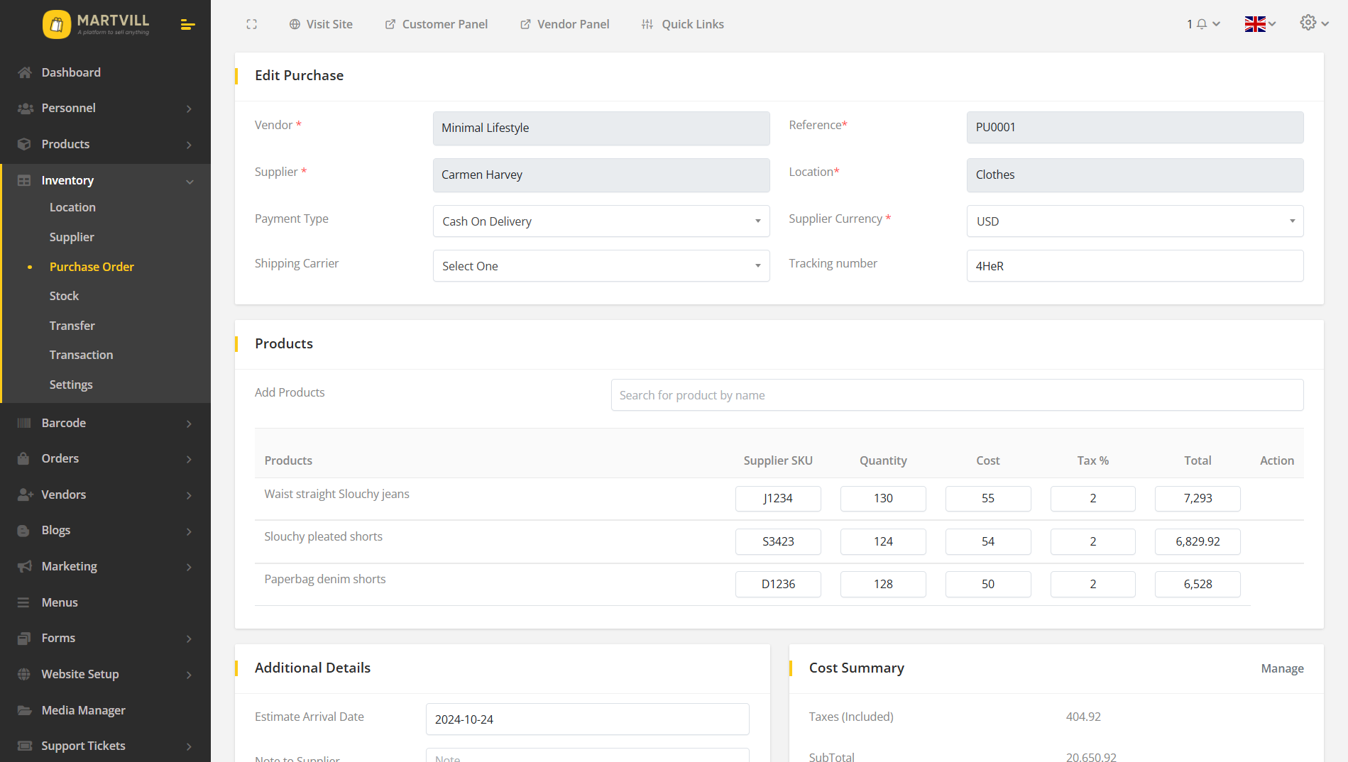 To modify an existing purchase order, click the Edit button from the purchase order list page. This action will open an interface allowing you to update the purchase order details. It is crucial to ensure all changes are precise and accurate before saving to maintain data integrity. An admin or a vendor can even delete an existing purchase order.