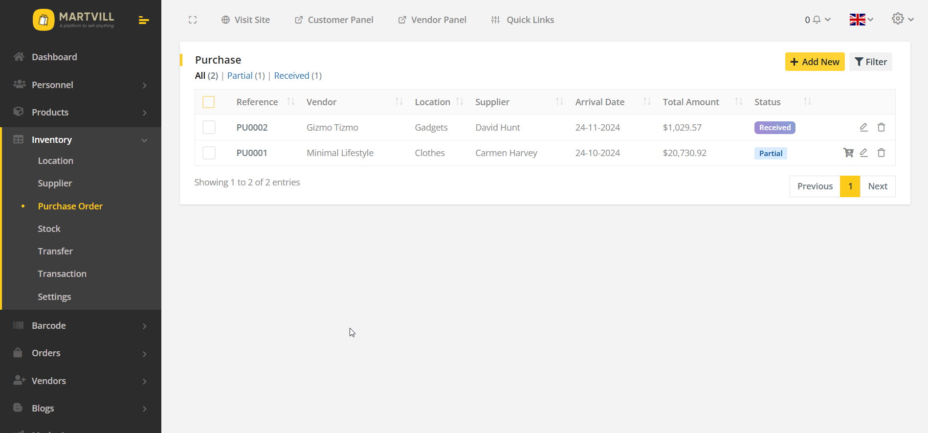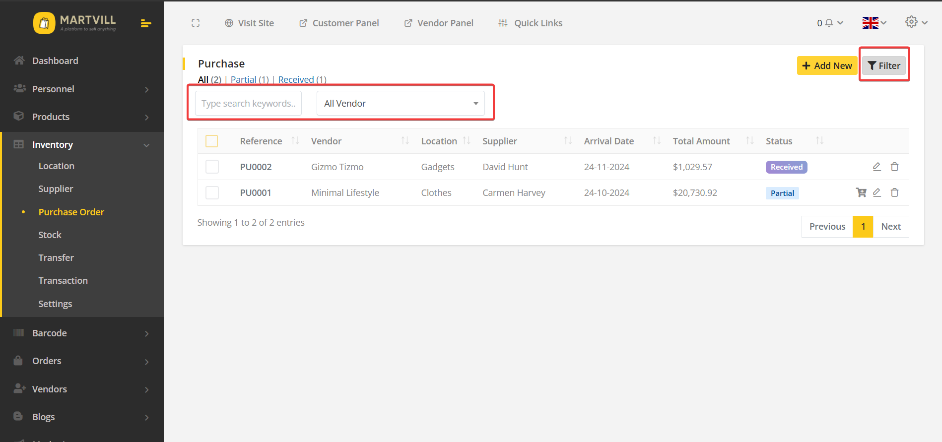 - Vendor: the vendor associated with the purchase order(not for vendor panel)