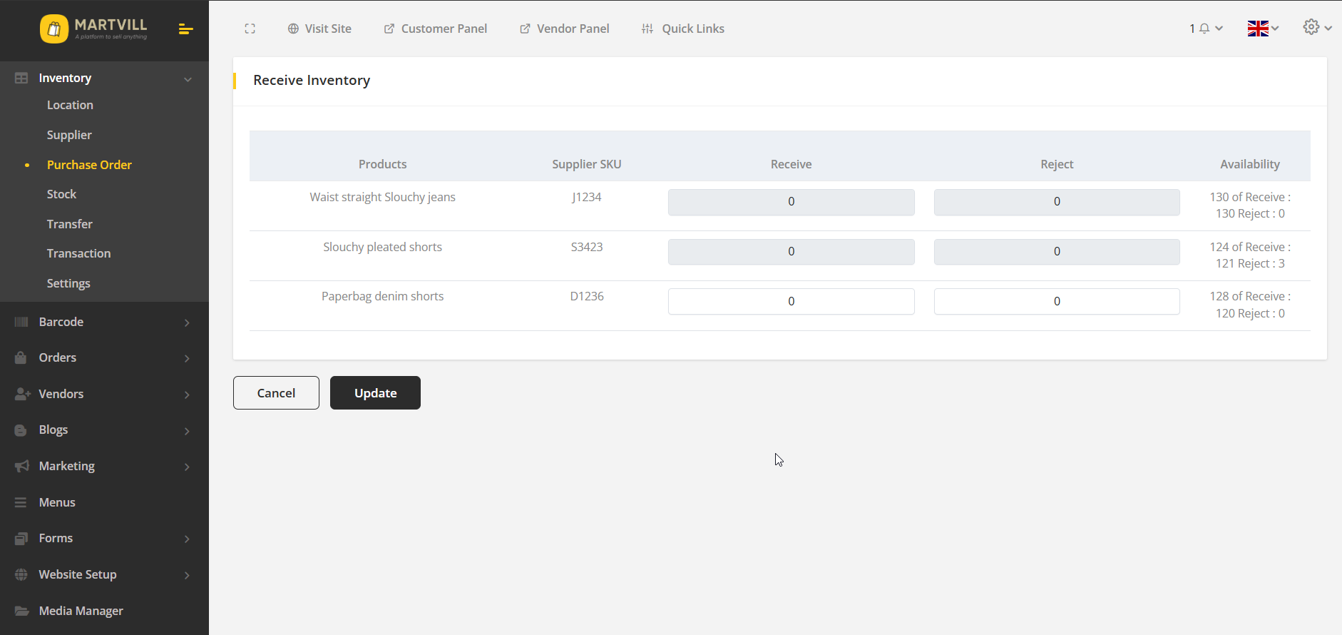 To process a purchase order, select the Receive button. This will display an interface where you can enter the quantities received or rejected and update the status accordingly.
