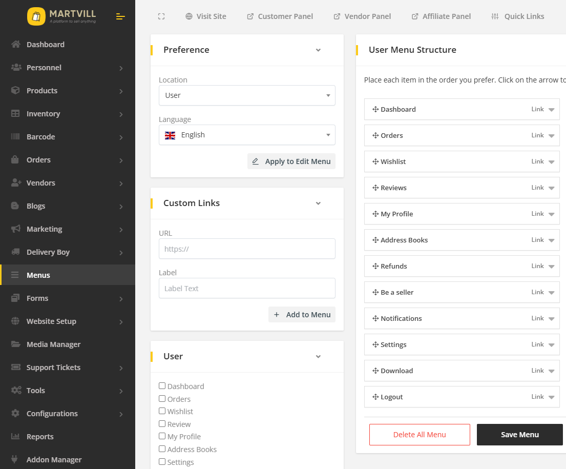 Initially it will show the menu structure of the user. There are five options- Admin, User, Vendor, Public header and Carrier whose menu structure can be edited.