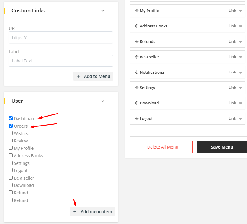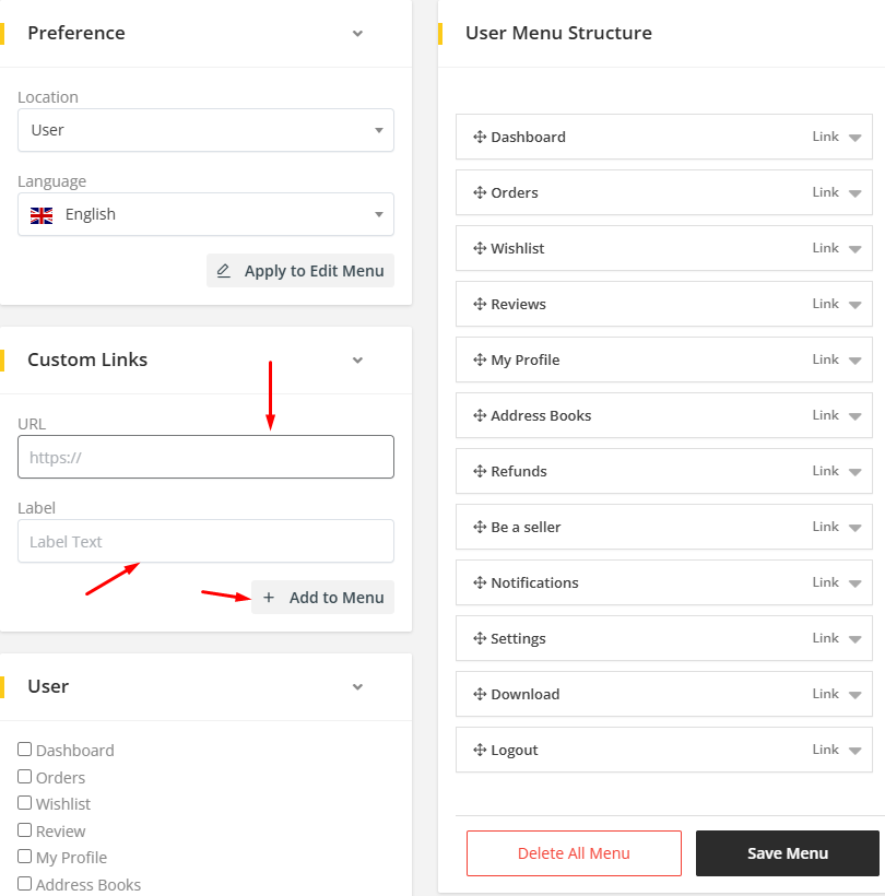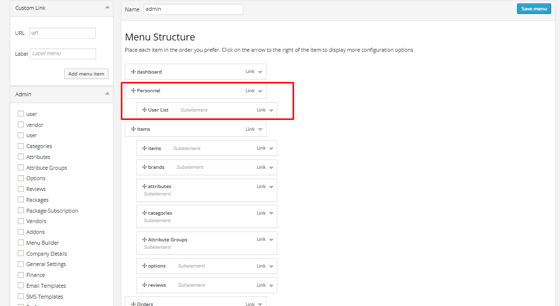 3. Custom menu item can be added to the menu structure by adding URL in the Custom Links section. Give a name/label for the menu in Label field and enter the URL to the URL field and click on Add to menu. Then a custom menu item will be add to that user-role's menu structure and it can be accessed from that user role's panel.