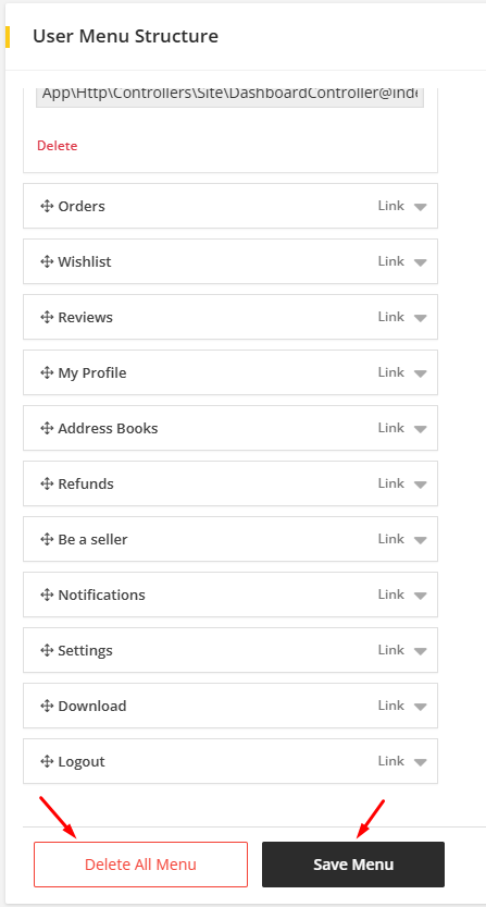6. A Delete All Menu option is available at the bottom of the menu structure to delete the whole menu structure. There is Save menu buttons to save any changes to the menu structure.