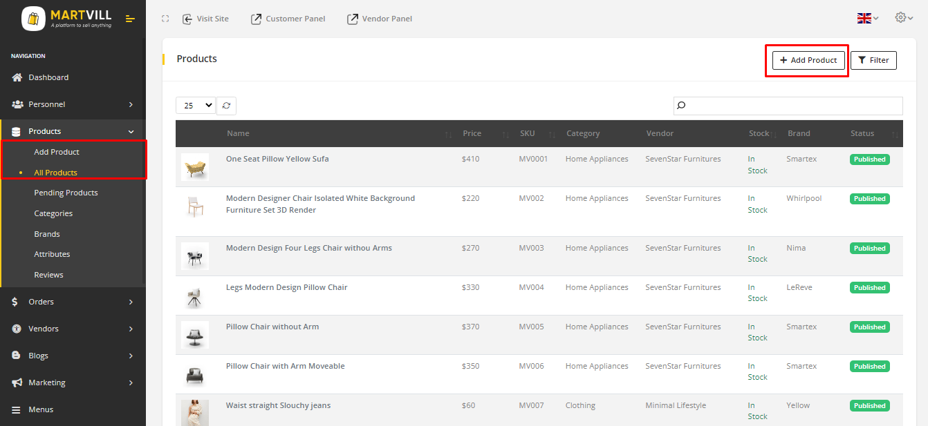 - Go to MartVill Dashboard > Products > Add Products or MartVill Dashboard > Products > All Products > Add Product