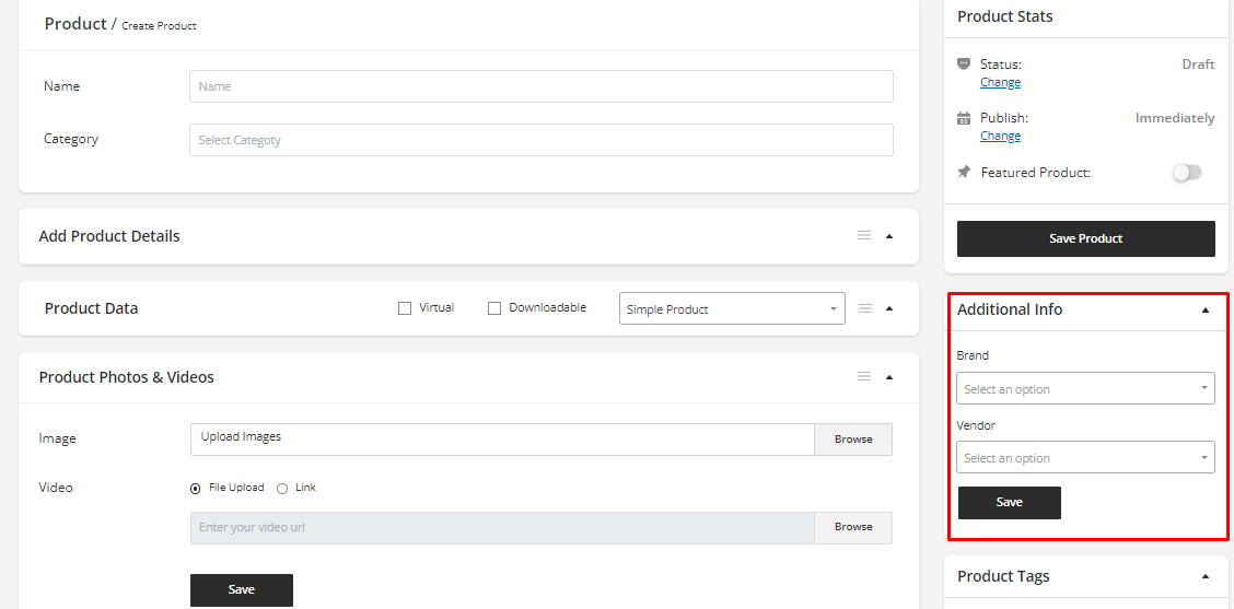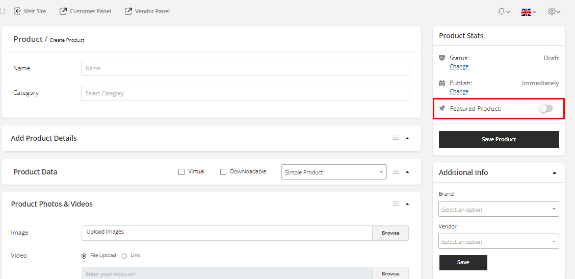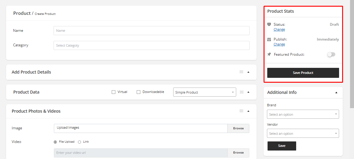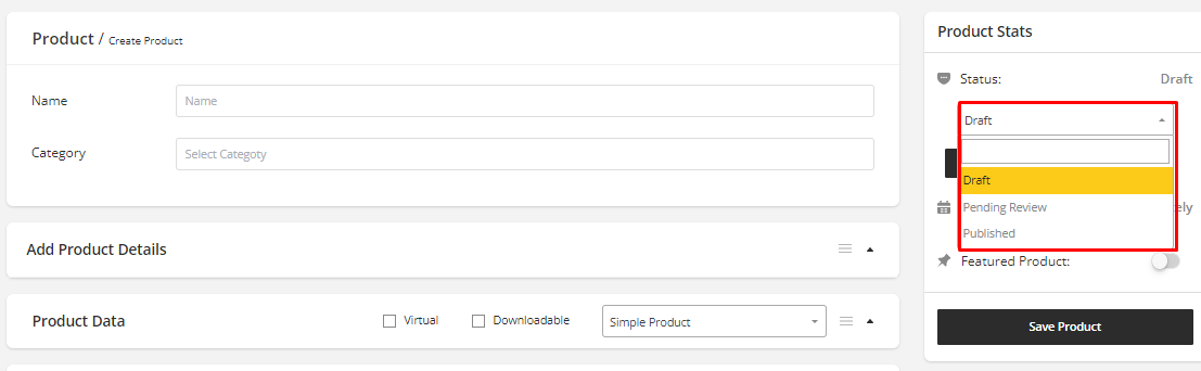 - Status: Select status of the product. Draft will keep that product as draft which will keep the product information but it will not be published to website. Pending Review is to keep the product for reviewing and Published is to publish the product to the website.
