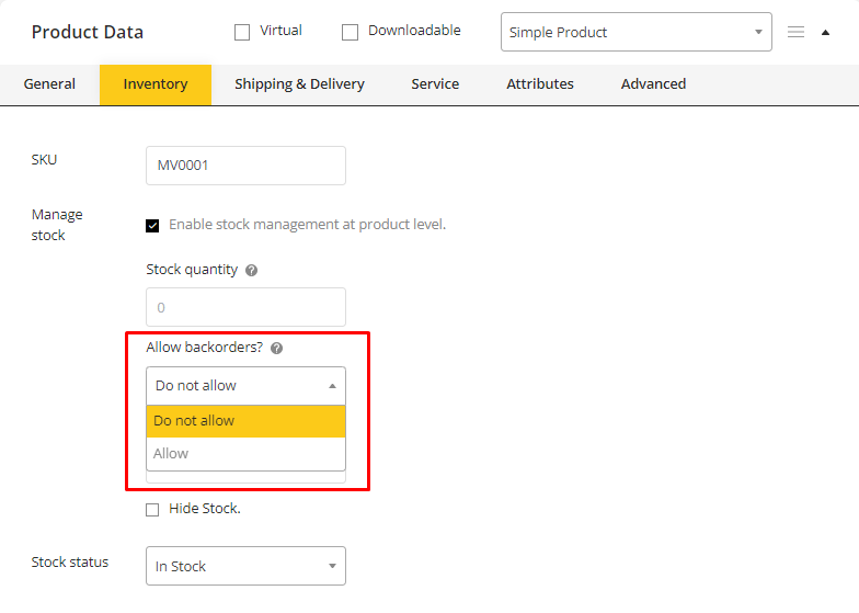- Do not allow: This will not allow any backorders. If product stock reach 0 then it will show to customer that it is stock out.