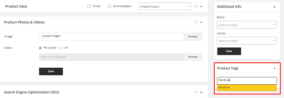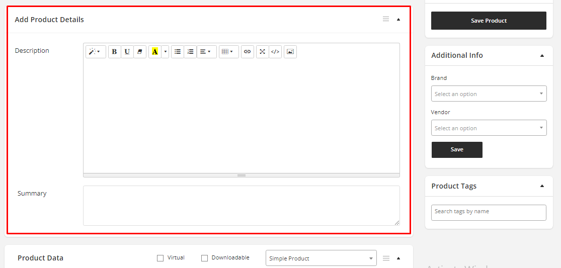 - Add description and summery of your product in the text area of Description and Summery respectively. Both will be visible in the website's product details page.