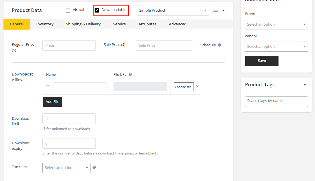 For maximum flexibility, downloadable products can also have a shipping cost (for example, if you were offering a product which can have both a packaged and a downloadable version then this would be ideal). You can also enable the Virtual product box if the downloadable product is not shippable.