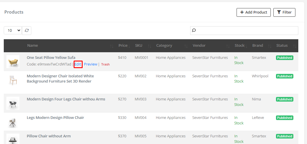- Hover on a product which you want to edit, Edit option will be visible. Click on it and you will be edit the product any information.