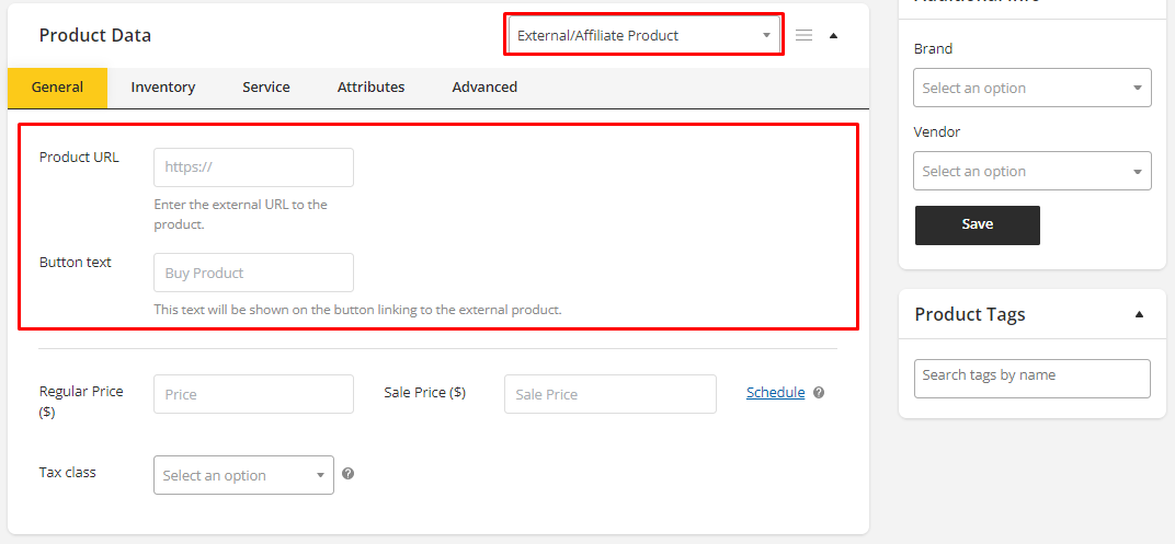 Select External/Affiliate from the product type dropdown. The Product data metabox will change in this case. Shipping section will be removed and two options will be added in the general section. The Product URL field is the destination where users can purchase this product. And Button text will be shown on the button linking to the product URL.
